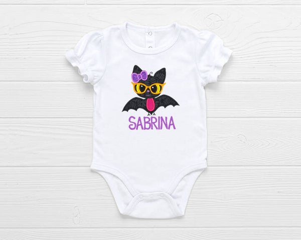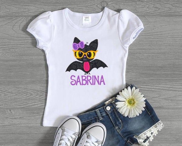 Halloween Bat Girl Shirt with Glasses. Shirt sizes 2T-10 and bodysuit sizes 0/3 months - 12-18 months.