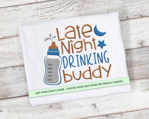 Late Night Drinking Buddy shirt or bodysuit. Shirt sizes 2T-10 and bodysuit sizes 0/3 months - 12-18 months.