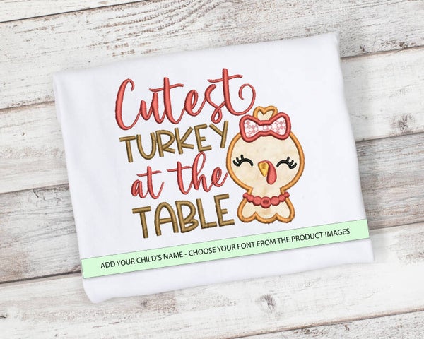 Cutest Turkey at The Table Thanksgiving Shirt for Girls. Shirt sizes 2T-10 and bodysuit sizes 0/3 months - 12-18 months.