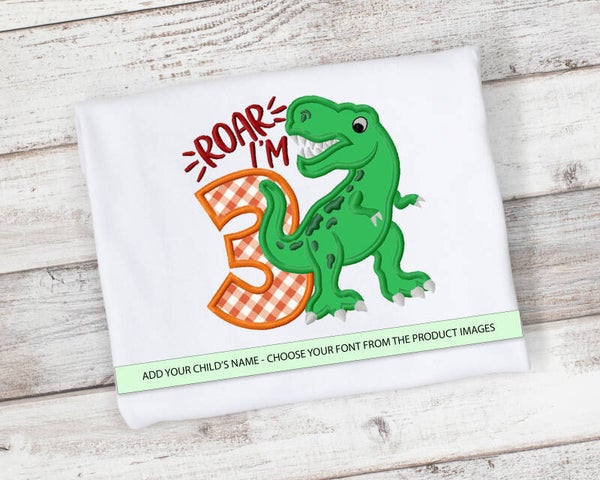 Roar I'm 3 Dinosaur Shirt. Shirt sizes 2T-10 and bodysuit sizes 0/3 months - 12-18 months.
