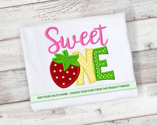 Sweet One, 1st Birthday Strawberry Shirt. Shirt sizes 2T-10 and bodysuit sizes 0/3 months - 12/18 months.