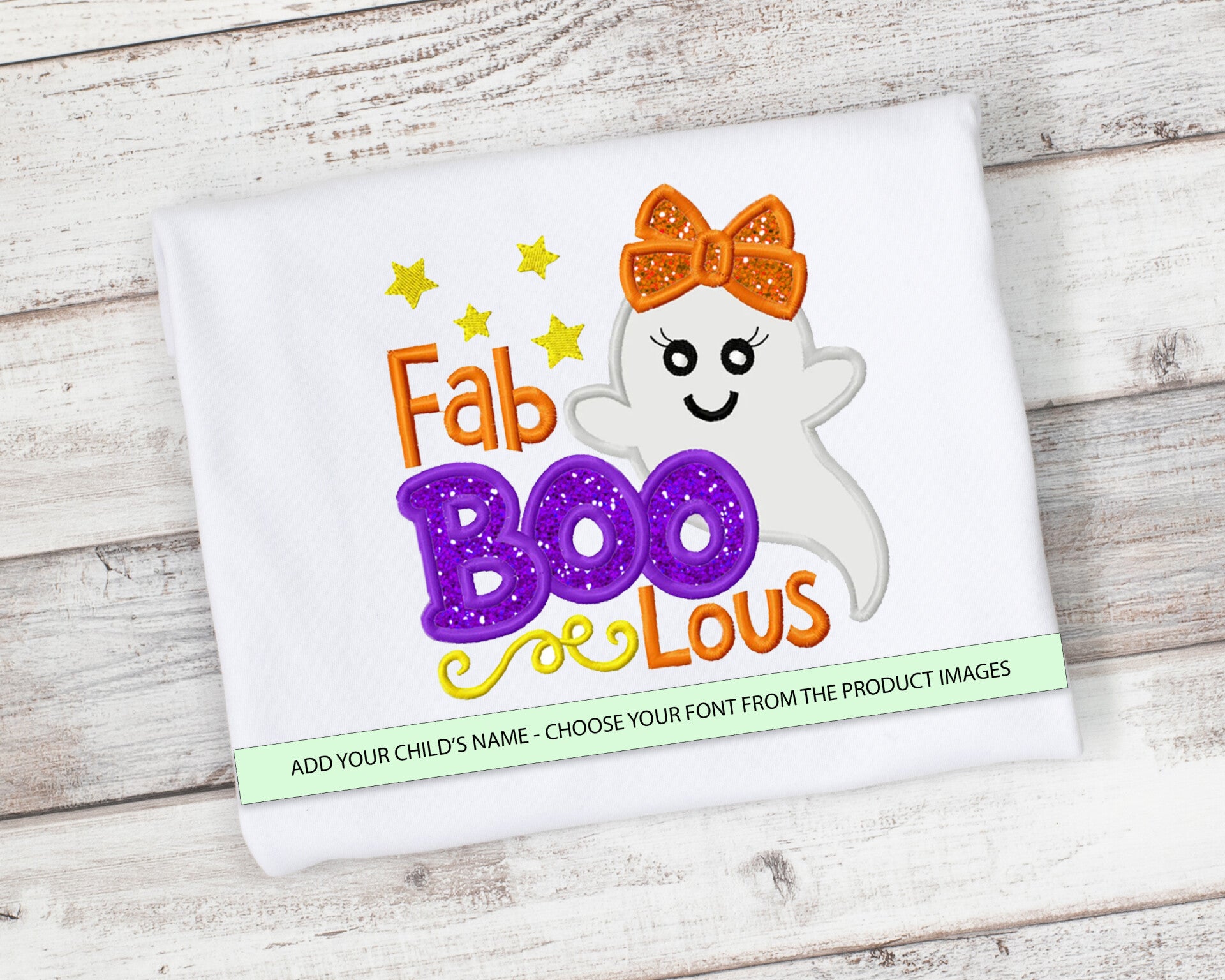 Fab Boo Lous Halloween Ghost Shirt. Shirt sizes 2T-10 and bodysuit sizes 0/3 months - 12-18 months.
