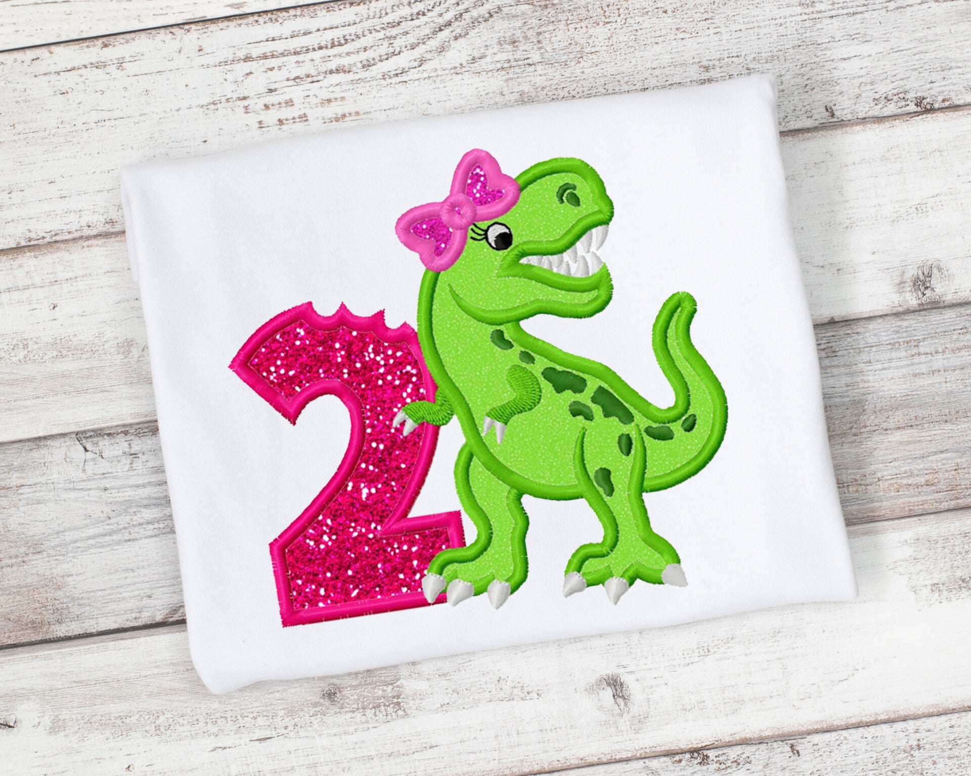 2nd Birthday Dinosaur Girl Embroidered Shirt or Bodysuit. Shirt sizes 2T-10 and bodysuit sizes 0/3 months - 12-18 months.