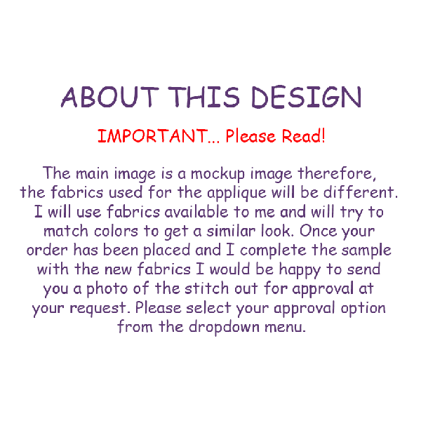 Please select your design approval preference from the dropdown menu. If approval is needed you will need to respond to your email within 24 hours of receiving your proof, otherwise your item will be processed at my discretion.