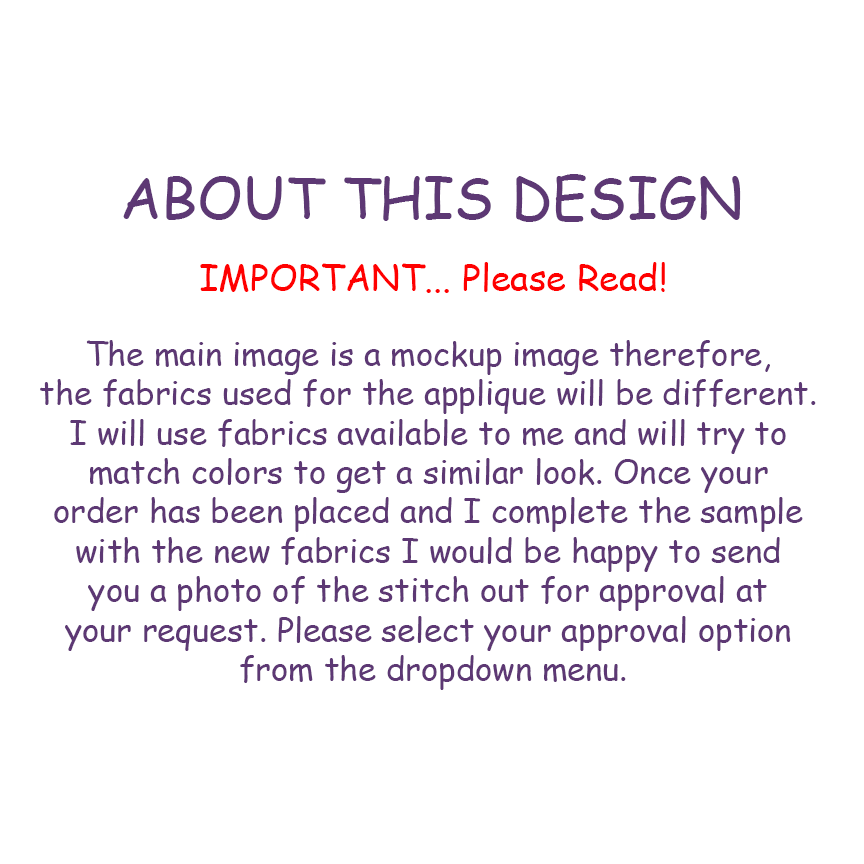 Please select your design approval preference from the dropdown menu. If approval is needed you will need to respond to your email within 24 hours of receiving your proof, otherwise your item will be processed at my discretion.