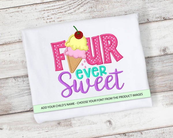 Four ever Sweet, 4th Birthday Embroidered Name Shirt or Bodysuit. Shirt sizes 12m-10 and bodysuit sizes 0/3 months - 12/18 months.