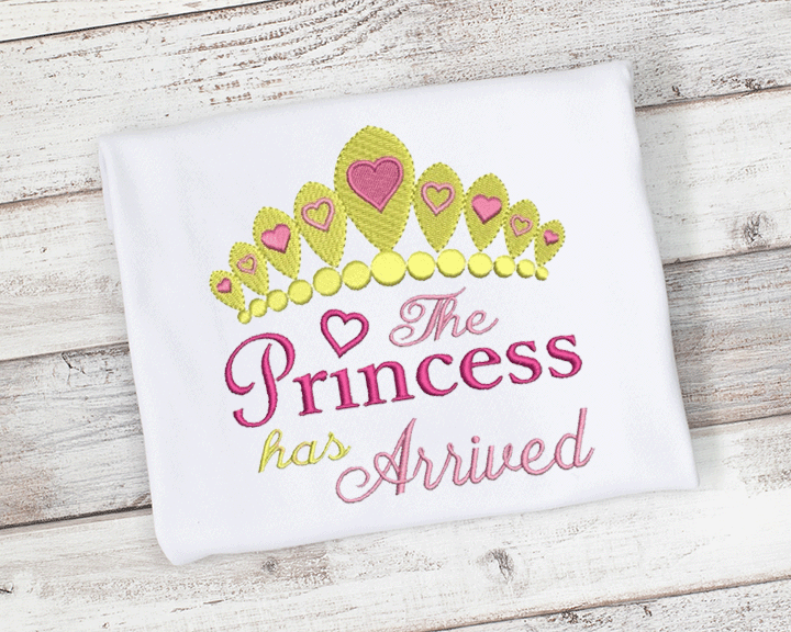 The Princess Has Arrived, New Baby Shirt or Bodysuit. Shirt sizes 2T-10 and bodysuit sizes 0/3 months - 12-18 months.