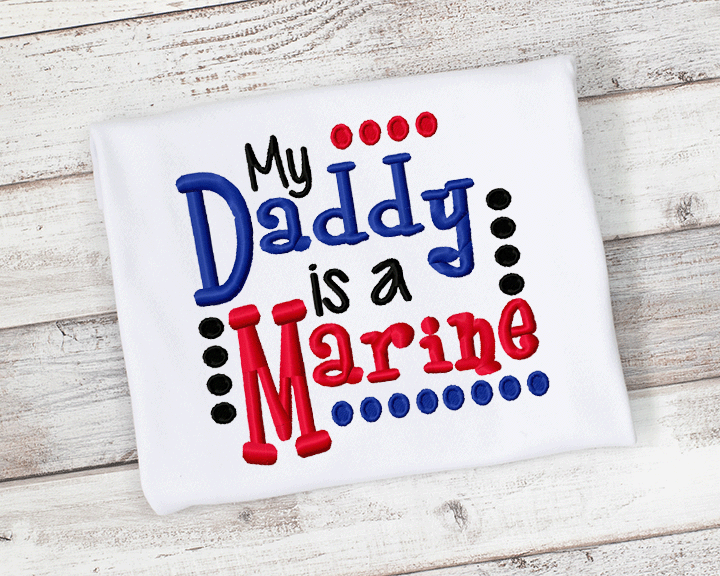 My Daddy is a Marine Embroidered shirt. Shirt sizes 12m-10 and bodysuit sizes 0/3 months - 12/18 months.